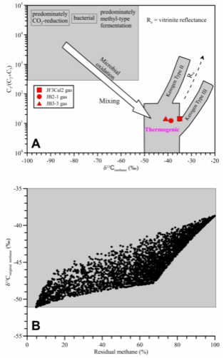 图4 方解石胶结物中捕获的原生包裹体中天然气组分及甲烷碳同位素数据(A)以及甲烷厌氧氧化前初始甲烷碳同位素恢复(B)